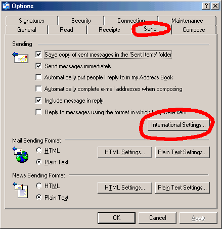 2. Options -ikkunasta (Valinnat), valitse Send -välilehti (Lähetys) ja paina International settings... (Kansainväliset asetukset...) nappia.