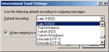 Unicode merkistön käyttö UTF-7 tai UTF-8 koodauksella on ollut itselläni käytössä jo noin kolme vuotta ja valitukset omituisista merkeistä ovat käyneet varsin harvinaisiksi. Jos haluat siirtyä suoraan UTF-8 -koodattuun Unicode -merkistöön, niin noudata ylläolevaa ohjetta kohdasta Outlook Expressin asetukset, mutta valitse Latin 9 -merkistön sijaan Unicode (UTF-8) lähtevän postin oletusmerkistöksi. Älä kuitenkaan vaihda viestien lukemisessa käytettävää oletusmerkistöä, sillä sitä asetusta käytetään vain silloin kun luettavan viestin merkistöä ei ole määritelty. Tämän paras vaihtoehto on Latin 1 tai Latin 9.