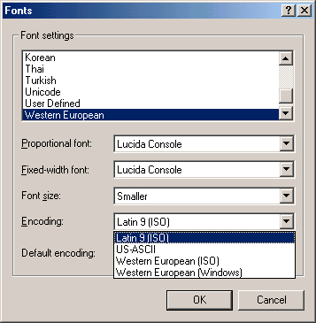 5. Fonts -ikkunassa (Kirjasimet) valitse Western European (länsieurooppalainen) kirjasinasetukseksi ja koodaukseksi (Encoding) Latin 9 (ISO). Tämän jälkeen pitäisi näkyä "Default encoding: Western European" (Oletusmerkistö: länsieurooppalainen) ja voit napsauttaa Set as Default (Aseta oletukseksi) ja OK -painikkeita. (Voit valita haluamasi kirjasimen käytettäväksi, kun viestejä näytetään, kunhan kirjasimeen kuuluu euron merkki.)